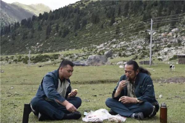 其美多吉与同事在雀儿山下席地而坐吃午餐